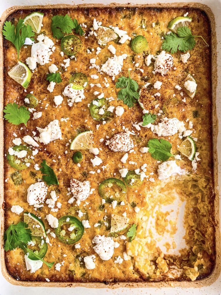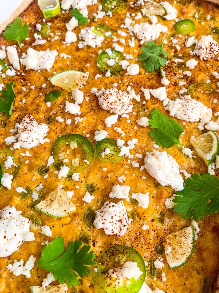 - Allow the casserole to cool slightly, about 5-10 minutes. Top with the cilantro, lime wedges, jalapeno slices, chili powder, sour cream and cotija cheese. Serve immediately.