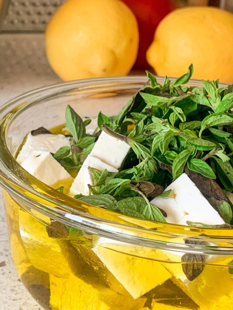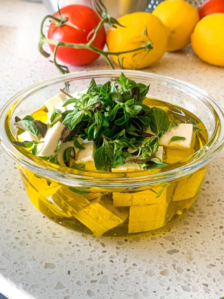 - Arrange the fresh oregano and lemon wedges on top of the cubes of feta and pour over the olive oil. You want to make sure you pour in enough olive oil so that the cheese is fully covered with oil and there are not pieces exposed to air.