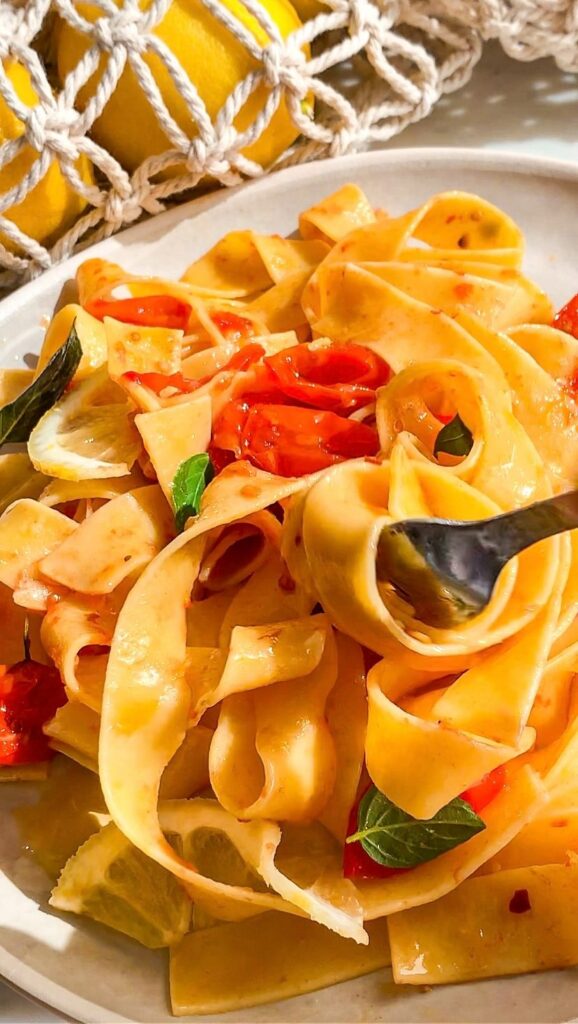 The citrus undertones of lemon basil make it an excellent choice for adding a refreshing and aromatic touch to a variety of dishes, which is exactly what I did here for this pappardelle! It’s lemony flavor matches perfectly with the Eureka lemons and ripe tomatoes.