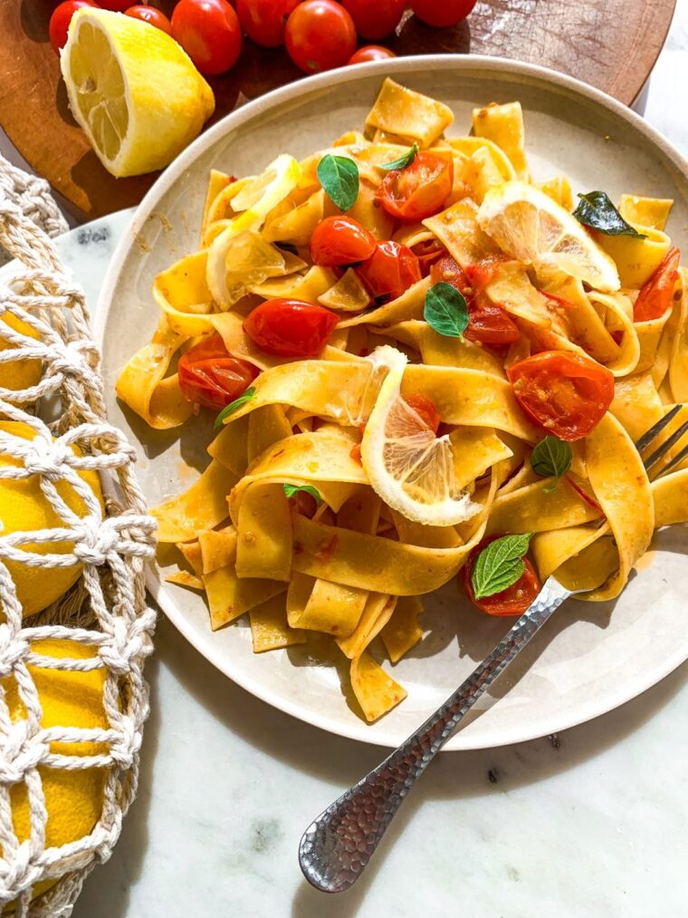 This recipe is the best of THREE worlds! There’s a little bit of everything here for all pasta lovers- whether you a fan of tomato sauce, pasta al limone, or oil based garlic sauces! So the next time you can’t decide what kind of pasta you want, give this winner a try!