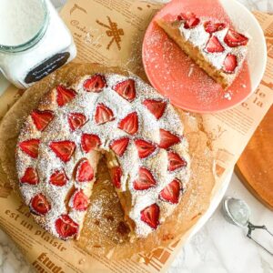 Let the cake cool for 15 minutes before dusting with powdered sugar and cutting into slices.