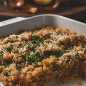 Pour the rice and onion mixture into a 8"x12" baking dish or an oven proof Dutch oven.