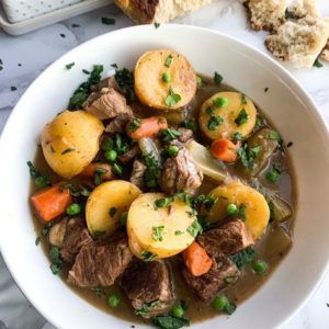 Skip the dirty dishes and make this cozy one-pot stew Instead! The caramelized onion and bacon broth is an absolute game changer and replaces the long cooking times needed for traditional stews. The flavor is better the next day, so feel free to make it ahead of time and serve the next day!