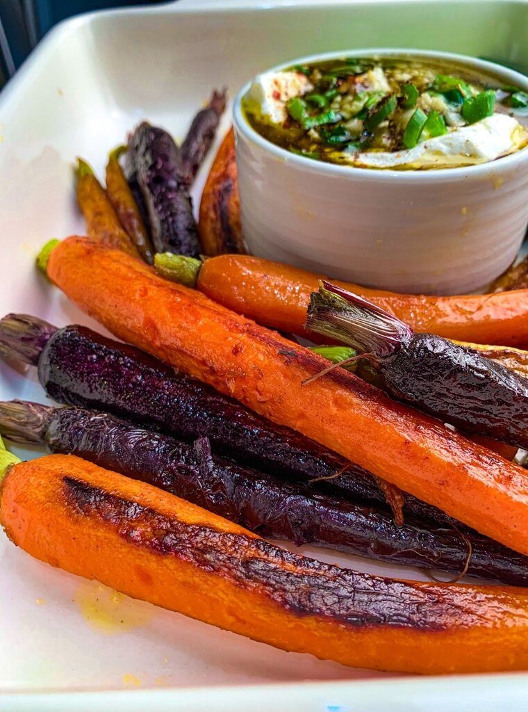 We start with fresh carrots, pan roast them in a little oil, and then pair them with a spiced yogurt dip fragrant with cumin, lemon, za’atar, garlic, and chili flakes.